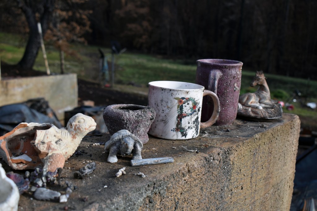 Little bits of things I love that were recovered from the rubble after our house burned in the 2020 Slater Fire. The porcelain horse in the back was from my grandmother Hazel. The clay pot in the middle was made by my niece in the 8th grade.