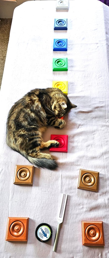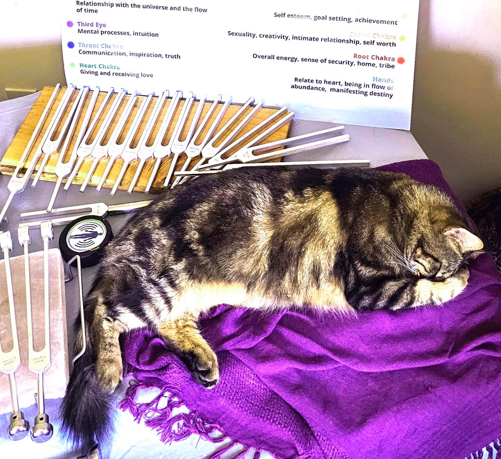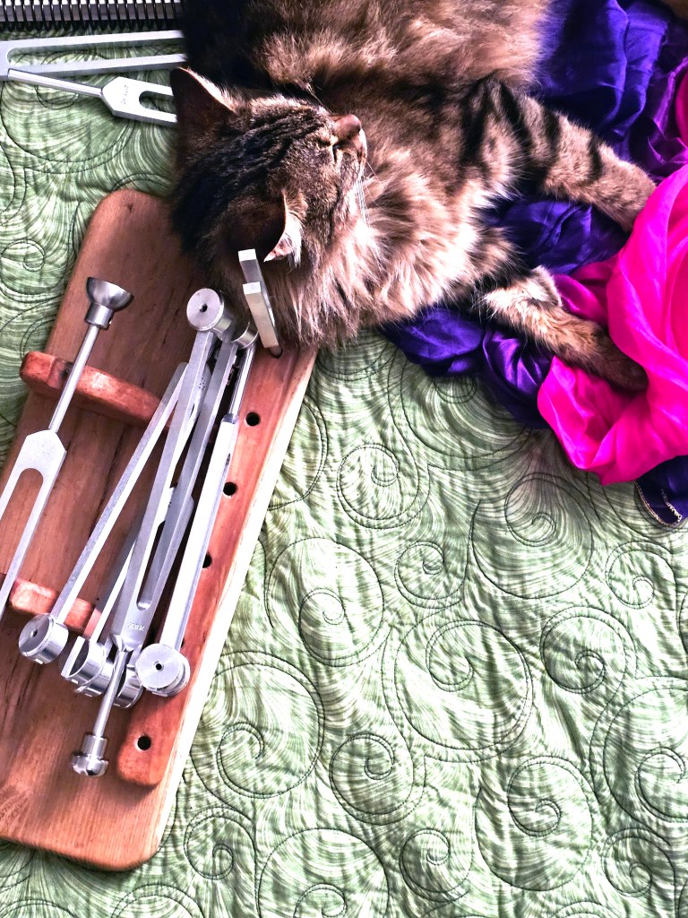 One of my cats in particular, Tiger, has a special affinity for tuning forks, and she is often the one who is soaking up most of the attention.